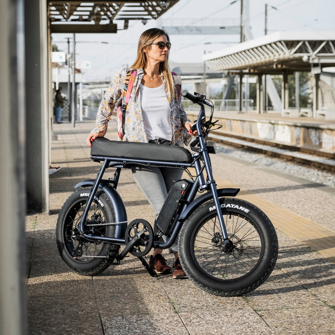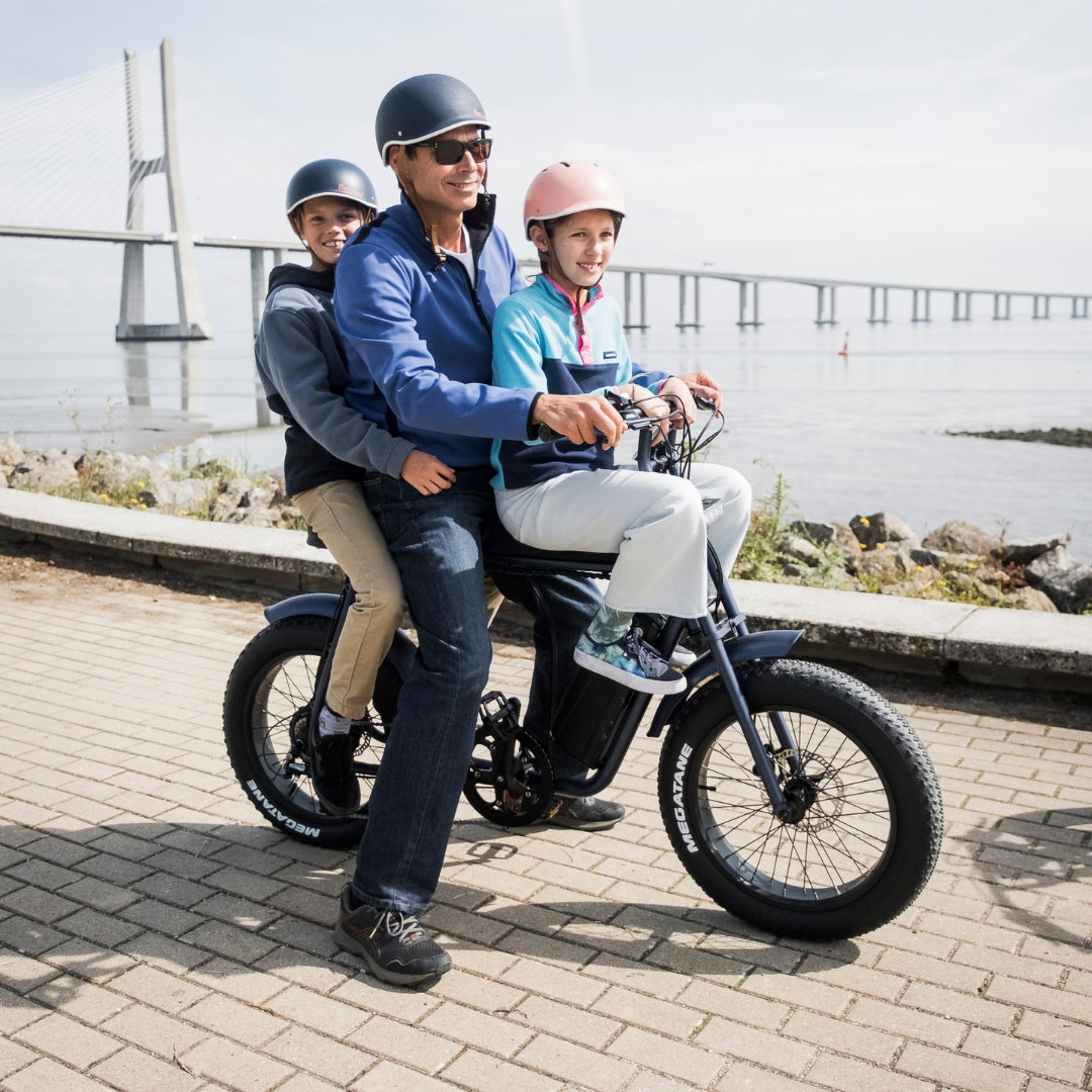 Traveling with kids? Our E-Bikes are legal for 2 people. Explore our accessories, including an extra-long seat and front footpegs, perfect for family adventures.