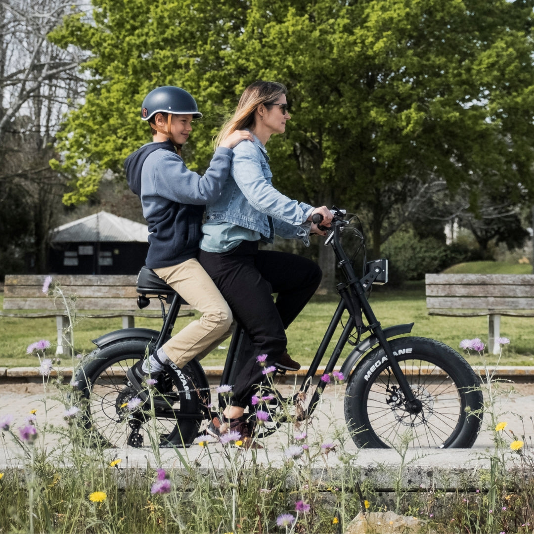 Our E-Bikes are legal for 2 people. Explore our accessories, including the child seat and footpegs, perfect for family adventures.